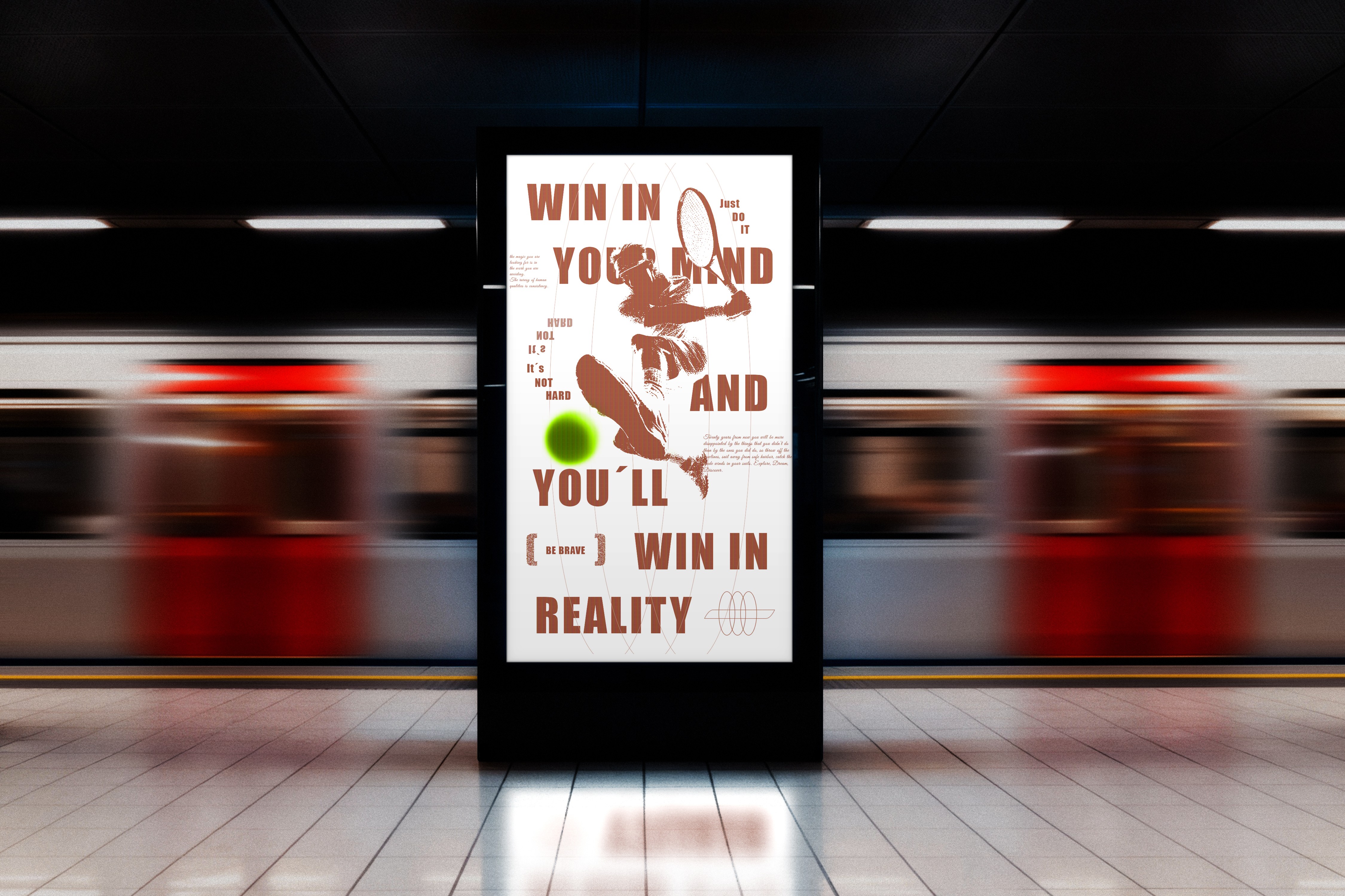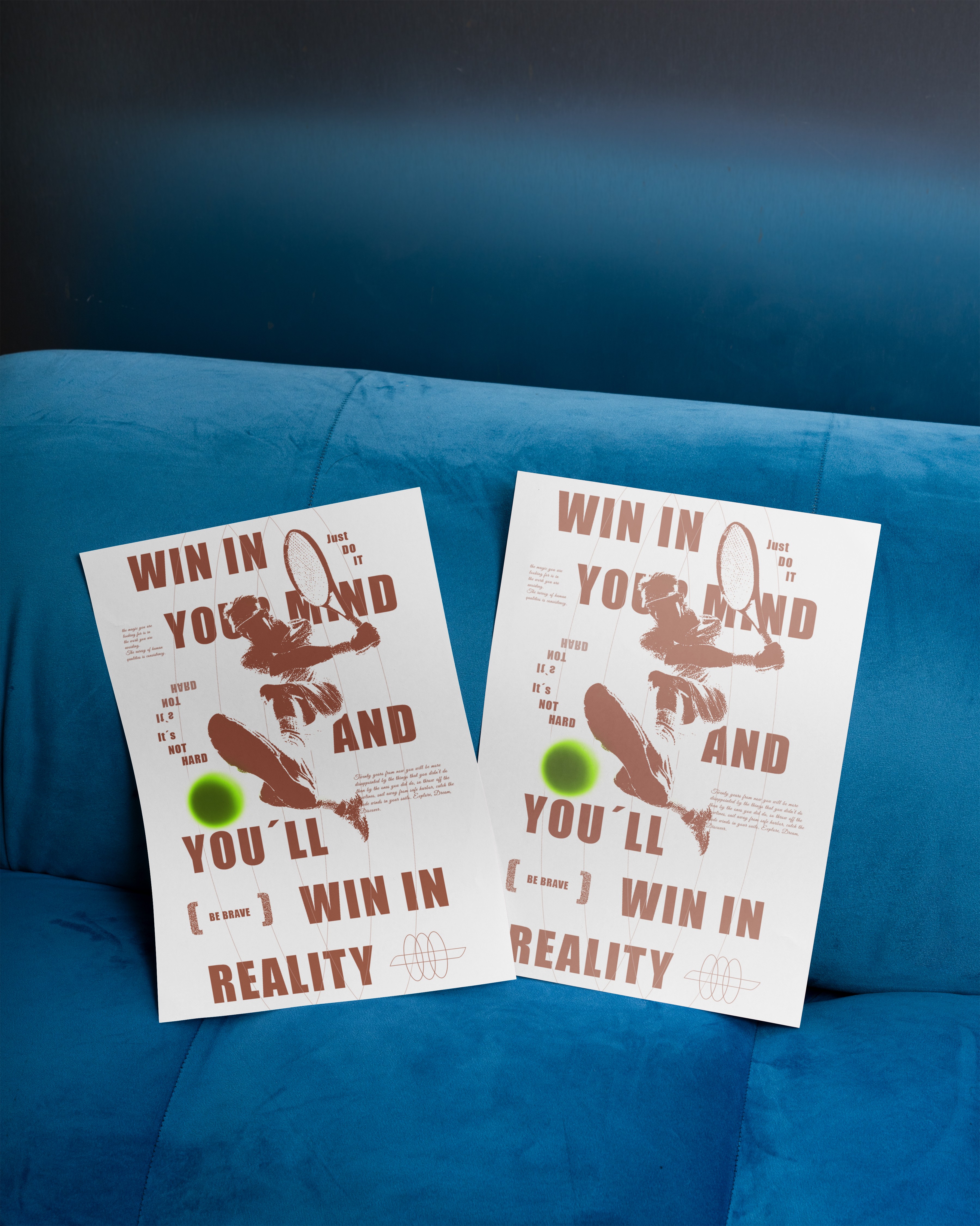 A bold visual exploration of mindset, discipline, and the psychology of winning. This poster design fuses athletic energy with motivational typography to remind us that achievement starts long before action — it begins in the mind. Using a textured, earthy color palette and expressive brush-style illustration, the composition captures motion, drive, and determination. Inspirational phrases such as “Win in your mind, and you’ll win in reality” and “Just do it” reinforce the theme that consistency and courage are the foundations of success. The green glowing sphere symbolizes focus, momentum, and the spark of inner motivation — the moment determination shifts from thought to action. Subtle background curves echo mental cycles, perseverance, and progress.
